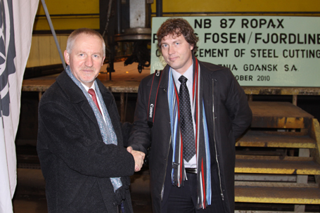 Stanisław Twarowski - szef działu handlowego Stoczni Gdańsk SA (po lewej) i Arild Kalkvik, dyrektor ds. marketingu i sprzedaży stoczni Bergen Group Fosen. W pierwszym cięciu blach w Gdańsku na nowe promy typu ro-pax dla Fjord Line, z zaplanowanymi w wysokim standardzie pomieszczeniami pasażerskimi (określane przez armatora jako cruise ferries, przeznaczone na linie Bergen - Stavanger - Hirtshals i Kristiansand - Hirtshals), wzięli udział przedstawiciele armatora i norweskiej stoczni. Morten Larsen - dyrektor techniczny Fjord Line - osobiście wystartował sterowaną numerycznie maszynę do plazmowego cięcia blach w Stoczni Gdańsk. Stocznia Bergen Group Fosen (Fosen Yards, dawniej Fosen Mekaniske Verksteder) znana jest m.in. z budowy pierwszego na świecie luksusowego apartamentowca (The World), a w Polsce – jako budowniczy ro-ro Amber eksploatowanego przez Euroafrica Linie Żeglugowe ze Szczecina
