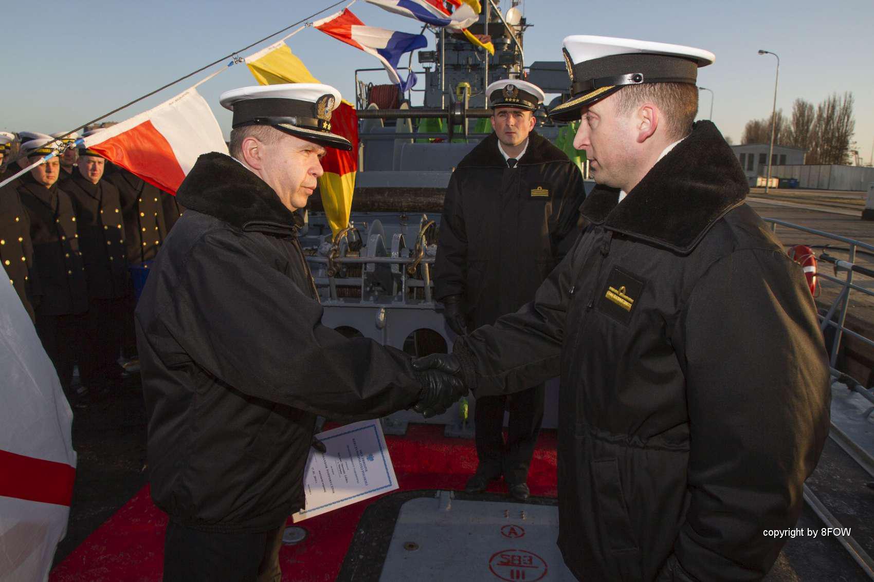 Uroczystość objęcia obowiązków dowódcy okrętu odbyła się zgodnie z marynarski ceremoniałem. Obecni byli dowódca dywizjonu, dowódcy okrętów grupowych oraz załoga okrętu. W trakcie uroczystości komandor porucznik Krzysztof Sumlicki - dowódca 12. Dywizjonu Trałowców wręczył nowemu dowódcy „Znak Dowódcy Grupy Jednostek Pływających - Dowódcy Okrętu” symbol sprawowania władzy nad grupą okrętów, okrętem i jego załogą. Znak ten powiewać będzie na maszcie „Reska” przez cały okres dowodzenia okrętem przez komandora podporucznika Sławomira Górę. W trakcie uroczystości, kmdr ppor. Sławomir Góra podziękował dowódcy dywizjonu za powierzenie mu odpowiedzialnej funkcji dowódczej oraz za zaufanie.