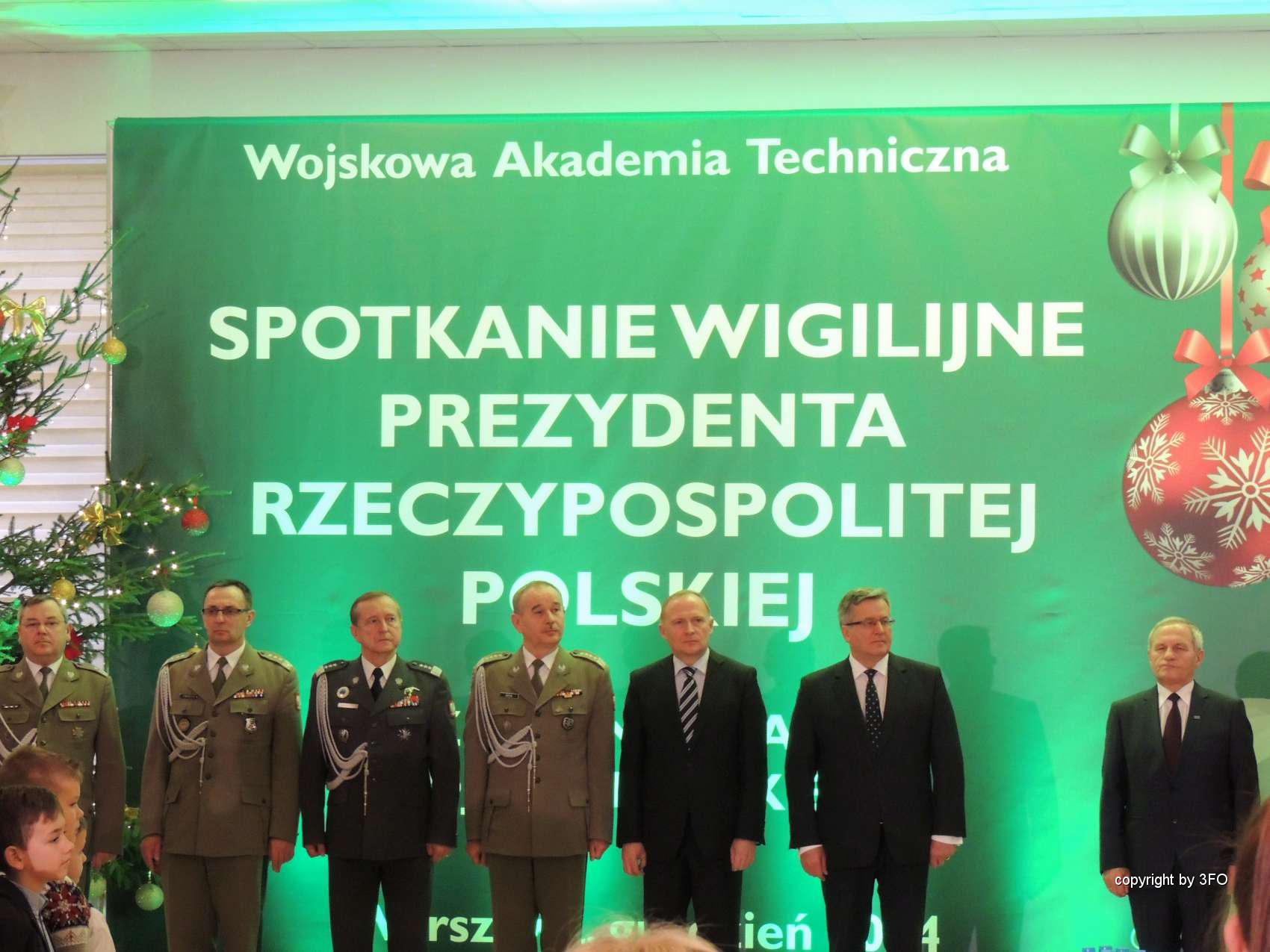 We wtorek, 16 grudnia, w Warszawie odbyło się żołnierskie spotkanie opłatkowe z udziałem Prezydenta RP Bronisława Komorowskiego. Obecni na nim byli marynarze z 3. Flotylli Okrętów. Dzisiaj w sposób szczególny obejmujemy serdeczną myślą żołnierzy służących na misjach w Afryce Środkowej, na Bałkanach i w Afganistanie – podkreślał prezydent Bronisław Komorowski. Spotkanie z Zwierzchnikiem Sił Zbrojnych odbyło się w Wojskowej Akademii Technicznej.