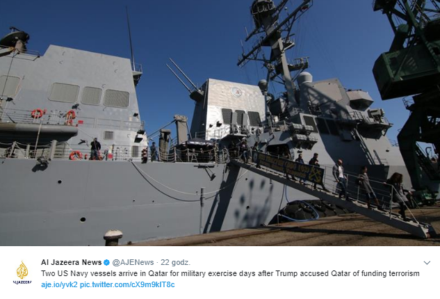 Pomimo tych wydarzeń Pentagon w zeszłym tygodniu docenił Katar za jego "trwałe zaangażowanie w bezpieczeństwo regionu" polegające m.in. na zgodzie na funkcjonowanie bazy wojskowej USA na jego terytorium. Nie poinformowano, czy przybycie dwóch okrętów wojennych w rejon Zatoki Perskiej było wcześniej zaplanowane i czy ma być to symbol wsparcia ze strony USA.