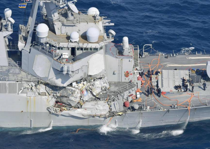 Według marynarki wojennej USA, około godziny 2.30 nad ranem czasu lokalnego w sobotę (19.30 czasu polskiego w piątek) 56 mil morskich na południowy zachód od japońskiego portu Jokosuka USS Fitzgerald został uderzony w prawą burtę przez kontenerowiec bandery filipińskiej ASX Crystal. Niszczyciel, który doznał uszkodzeń zarówno powyżej, jak i poniżej linii wodnej, dotarł w sobotę wieczorem czasu lokalnego do Jokosuki. Trzej ranni członkowie jego załogi - w tym dowódca, komandor porucznik Bryce Benson - zostali umieszczeni w szpitalu.