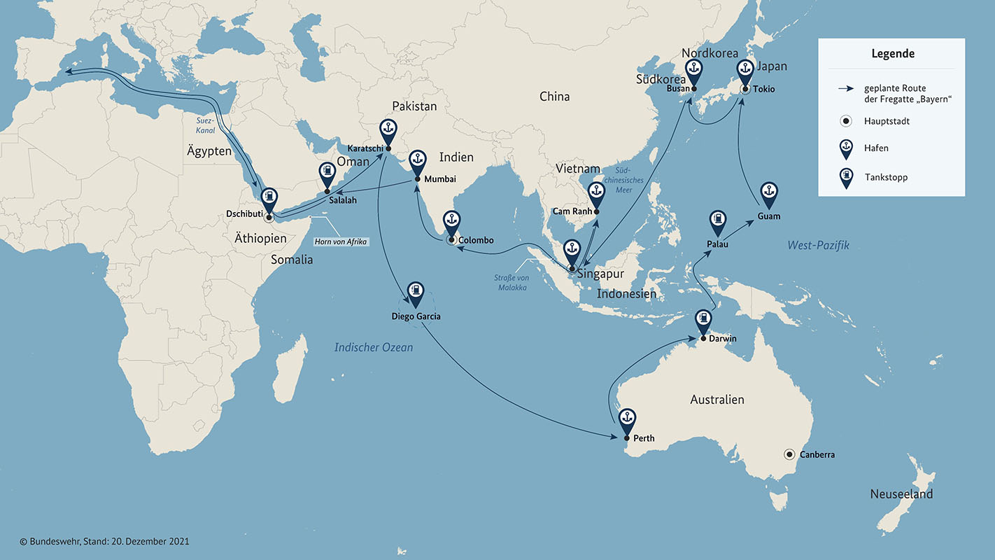 15 grudnia, ku niezadowoleniu Pekinu, okręt wpłynął na międzynarodowe wody Morza Południowochińskiego, jako pierwsza jednostka niemieckiej marynarki wojennej od blisko 20 lat. W poniedziałek fregata zawinęła do portu w Singapurze. Ma tam pozostać przez ponad dwa tygodnie, a następnie wypłynąć w dalszy rejs do Wietnamu.