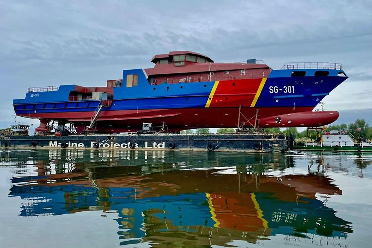 Częściowo wyposażony kadłub nowego patrolowca dla MOSG zbudowała firma NavireTech Sp. z o.o. z Gdyni na terenie użytkowanym przez firmę Marine Stal Sp. z o.o. w sąsiedztwie Stoczni Wisła w Gdańsku. Kadłub został nasunięty z placu montażowego i nabrzeża na barko-ponton należący do stoczni Marine Projects, a następnie - 20 czerwca - przeholowany na wspomnianym barko-pontonie do stoczni Marine Projects (patrz zdjęcie), przy której nabrzeżu dzień później zakończyło się nasunięcie kadłuba patrolowca z barko-pontonu na dok pływający. Wodowanie, zapowiadane na środę, odbędzie się przez zanurzenie tego doku pływającego.