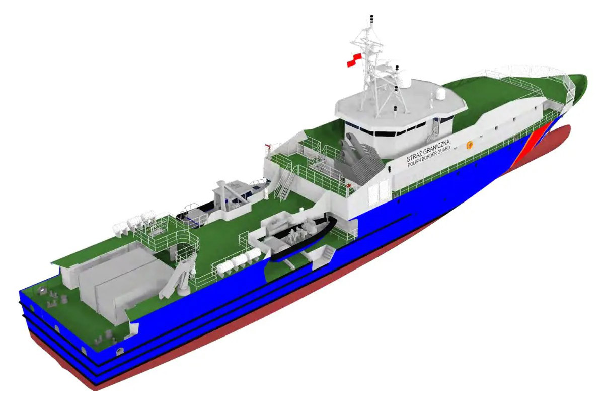 • na patrolowcu znajdą się dwie łodzie motorowe typu RIB; pierwsza to łódź kabinowa interwencyjno-abordażowa, druga, z pokładem otwartym, ma być przeznaczona do działań ratowniczo-interwencyjnych; będą one zdolne do rozwinięcia maksymalnej prędkości odpowiednio minimum 35 i 30 węzłów z możliwością podjęcia i transportu na jednostkę minimum 10 rozbitków; opuszczanie i podnoszenie łodzi będzie odbywało się przy użyciu dźwigów hydraulicznych umieszczonych na obu burtach;