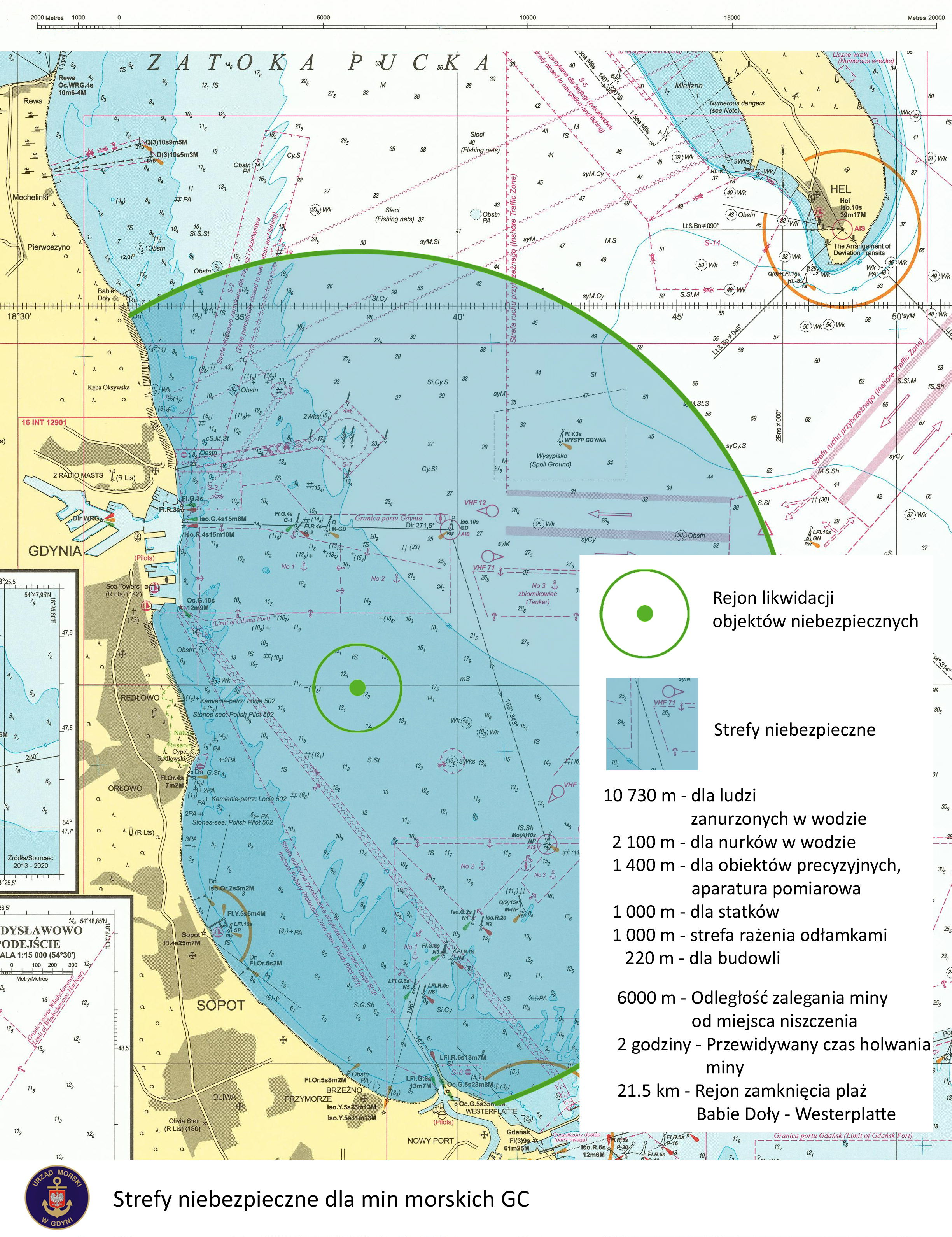 - w promieniu 750 m od niewybuchu obowiązuje strefa bezwzględnej ewakuacji ludności. Zakres oraz niezbędne działania ewakuacyjne przeprowadzone będą przez Wydział Zarządzania Kryzysowego i Ochrony Ludności Urzędu Miasta Gdynia.Koordynatorem działań na morzu jest Dyrektor Urzędu Morskiego w Gdyni, który wydał w ww. zakresie stosowne zarządzenie porządkowe.