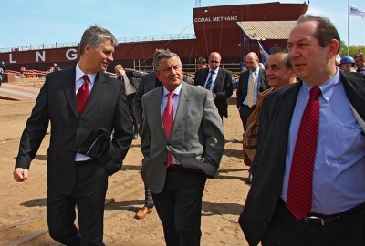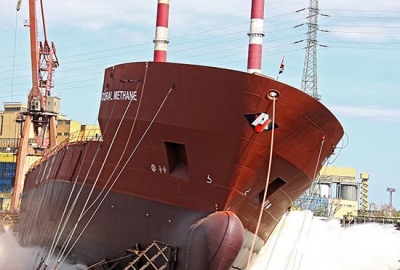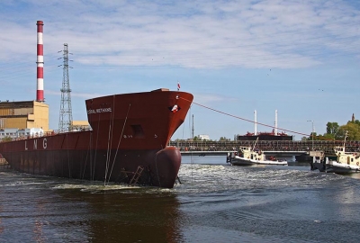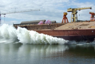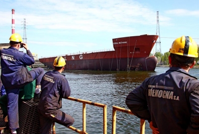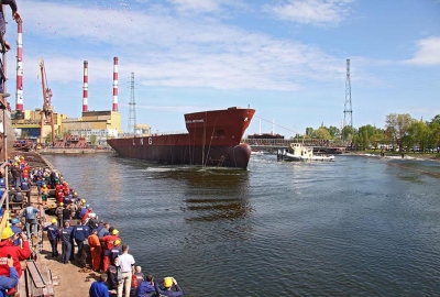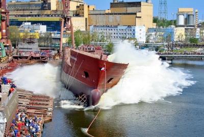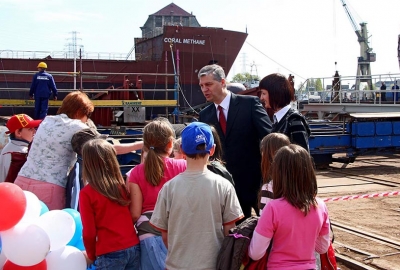 Wodowanie pierwszego budowanego w Polsce gazowca LNG - Coral Methane. 7 maja 2008, Stocznia Północna S.A. – Grupa Remontowa.