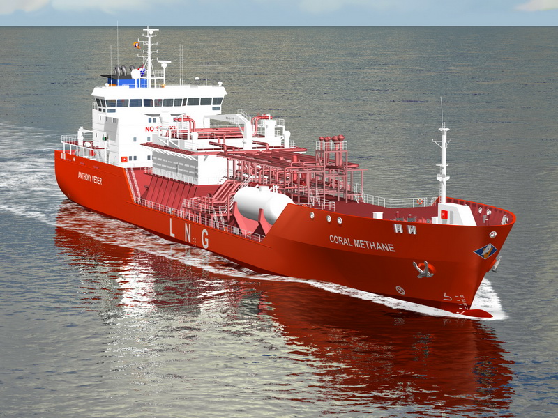 Renderyzacja komputerowa - gazowiec Coral Methane na wodzie, w ruchu.