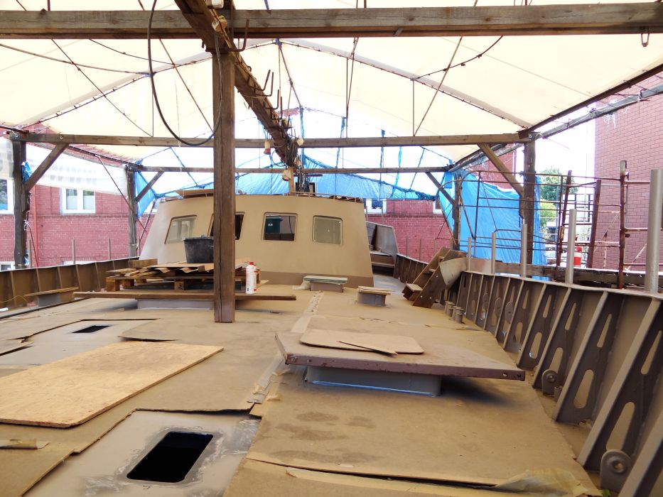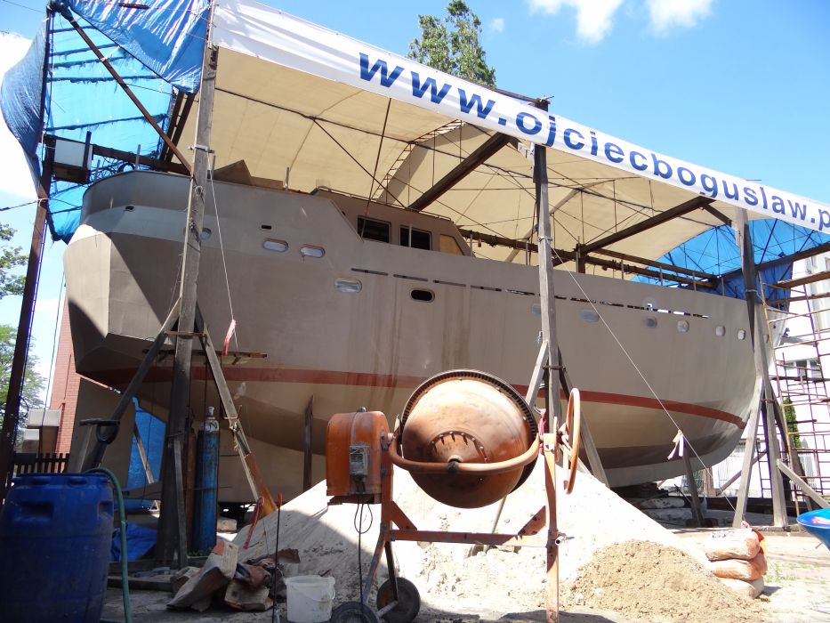 Od samego początku przyglądamy się postępom prac. Powoli, ale systematycznie budowa, realizowana głównie rękoma pensjonariuszy Św. Łazarza i pod okiem wytrawnego żeglarza kapitana Waldemara Rzeźnickiego, posuwa się do przodu. Kadłub Ojca Bogusława (jacht nosi nazwę od imienia swojego pomysłodawcy) jest już pomalowany. Trwają prace wewnątrz jednostki.