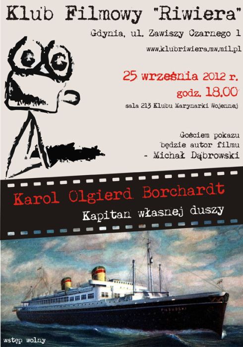 Klub Marynarki Wojennej „Riwiera” w Gdyni (ul. Zawiszy Czarnego 1) zaprasza na pokaz filmu dokumentalnego Michała Dąbrowskiego „Karol Olgierd Borchardt. Kapitan własnej duszy”.