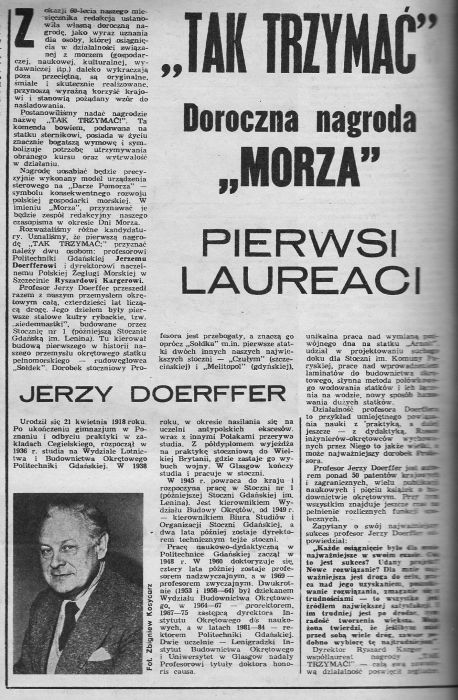 Nagroda „Tak trzymać!” miała postać miniaturowego modelu urządzenia sterowego Daru Pomorza. Była dorocznym wyróżnieniem miesięcznika „Morze”, przyznawanym osobom szczególnie zasłużonym dla polskiej gospodarki morskiej. W latach 1985-1993 wręczono ją pięciokrotnie, m.in. wybitnemu okrętowcowi Jerzemu Doerfferowi i projektantowi żaglowców Zygmuntowi Choreniowi.
