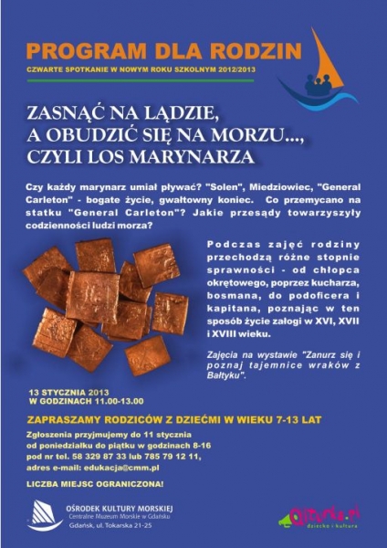 Zapraszamy na pierwsze w tym roku spotkanie z cyklu "Program dla rodzin", podczas którego dzieci wraz z rodzicami poznają tajniki życia marynarzy dawnych okrętów.