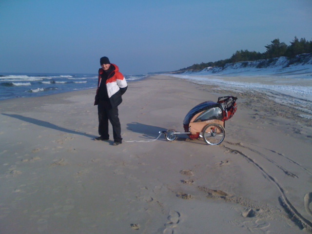 - Z Kołobrzegu wystartowałem w okolicach godziny 10 rano - relacjonuje na swoim blogu - Na początku mocno wiało i sypało śniegiem, później zaczął padać deszcz, a na końcu wszystko się uspokoiło. Droga przebiegła bez problemu a przed Sarbinowem była najpiękniejsza plaża jaką do tej pory widziałem.
