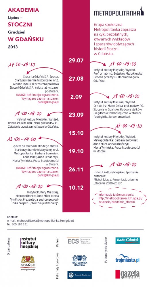 Dotąd mieszkańcy i turyści brali udział w spacerach w ramach projektu "Metropolitanka". Z końcem lipca rozpocznie się kolejny projekt związany ze Stocznią. Cykl otwartych wykładów i spacerów dotyczących przeszłości zakładu będzie bezpłatny dla wszystkich chętnych. Spotkania odbywać się będą w siedzibie organizatora, czyli Instytutu Kultury Miejskiej oraz na terenach stoczniowych.