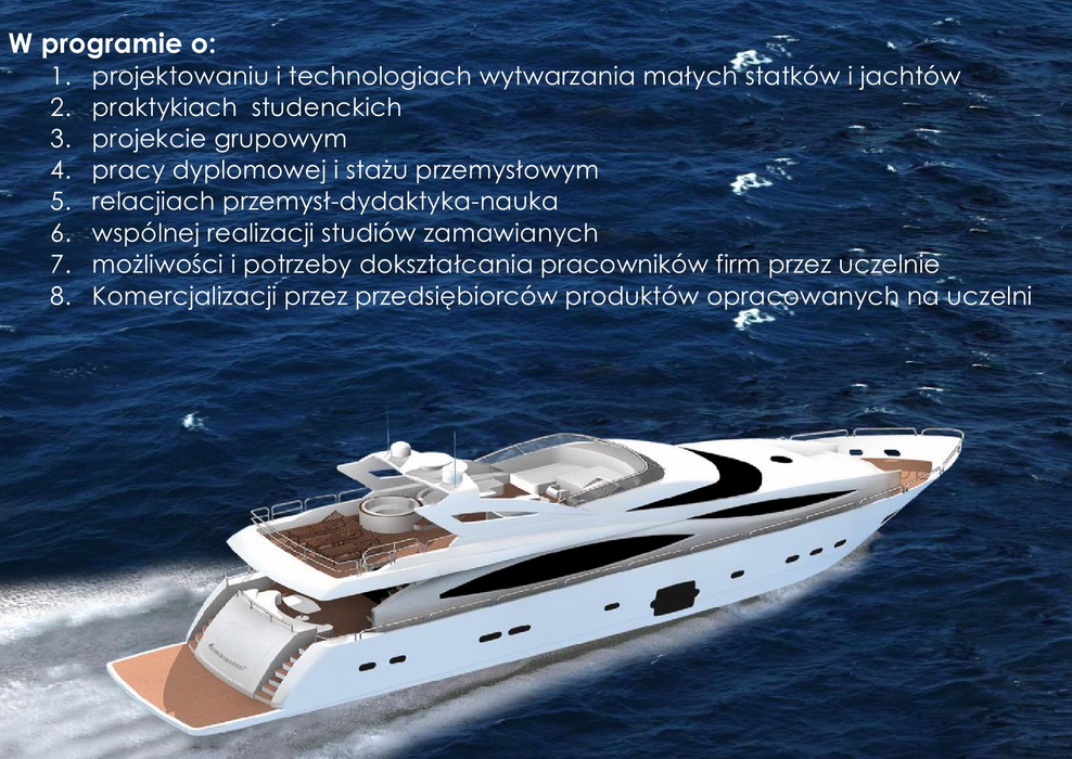 Podczas Yacht Day dyskutować się będzie m.in. o projektowaniu i technologiach wytwarzania małych statków i jachtów, o praktykach studenckich, relacjach przemysł – dydaktyka – nauka, wspólnej realizacji studiów zamawianych, możliwościach i potrzebach dokształcania pracowników firm przez uczelnię i komercjalizacji przez przedsiębiorców produktów opracowanych na uczelni.