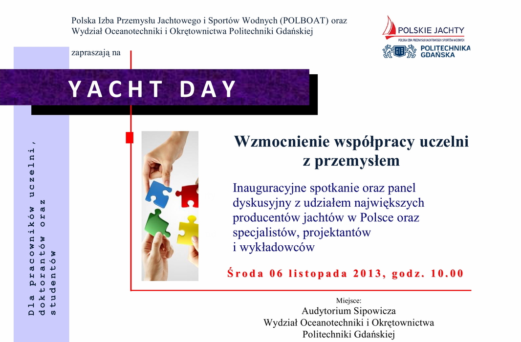 Polska Izba Przemysłu Jachtowego i Sportów Wodnych (POLBOAT) oraz Wydział Oceanotechniki i Okrętownictwa Politechniki Gdańskiej organizują dla pracowników uczelni, doktorantów oraz studentów Yacht Day - przedsięwzięcie mające na celu wzmocnienie współpracy uczelni z przemysłem.