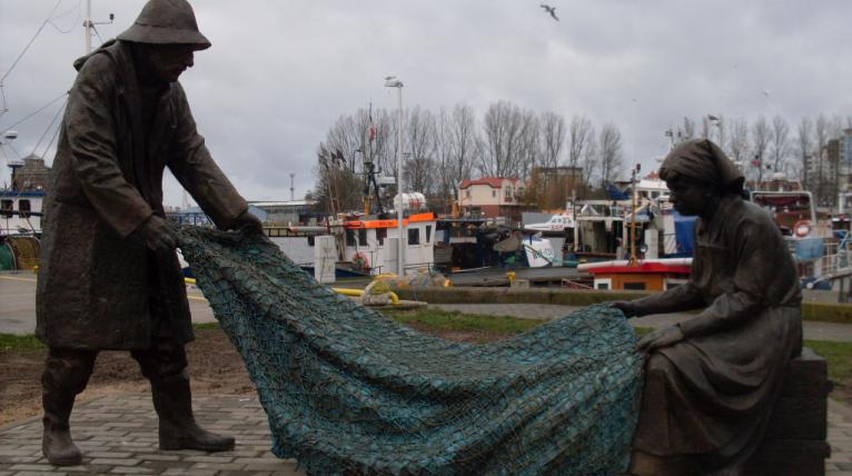 Pomnik rybaków: kobiety i mężczyzny stanął w kołobrzeskim porcie. Rzeźba Romualda Wiśniewskiego przedstawia dwie osoby trzymające sieć, na której można usiąść.