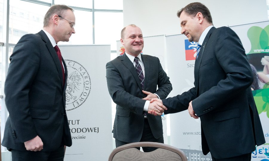 Piotr Krzystek oraz Łukasz Kamiński, prezes Instytutu Pamięci Narodowej i Piotr Duda, przewodniczący Solidarności, podpisali we wtorek list intencyjny w sprawie świetlicy dawnej stoczni im. Adolfa Warskiego w Szczecinie.