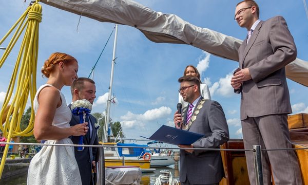 W niecodziennej uroczystości weselnej - ślubie na jachcie Magnolia - uczestniczyliśmy w Centrum Żeglarskim. Kapitan jachtu Mateusz Szubski oraz Magdalena Słowik zawarli związek małżeński. On jest sternikiem morskim, ona ma patent ratownika wodnego i znają się od czterech lat, a poznali podczas rejsu jachtem do Świnoujścia. Świadkami byli także żeglarze - Ania i Darek.