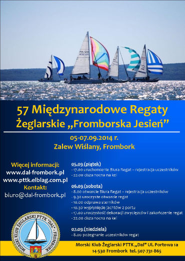Już w najbliższy weekend (5-7 września 2014 r.) we Fromborku odbędą się 57 Międzynarodowe Regaty Żeglarskie „Fromborska Jesień”. Impreza od lat przyciąga żeglarzy z całej Polski i z zagranicy, m.in. z Rosji, Litwy i Niemiec. Na zwycięzców wodnych zmagań czekają atrakcyjne nagrody i niespodzianki. Serdecznie zapraszamy!