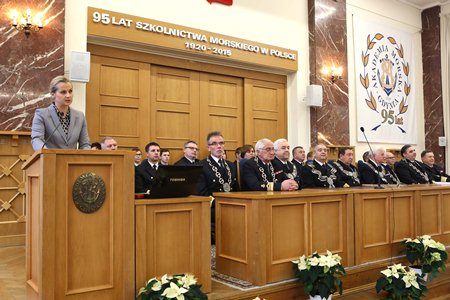 Podsekretarz stanu podkreśliła rangę uczelni, na którą składa się m. in. wysoko wykwalifikowana kadra naukowa i dydaktyczna, atrakcyjna oferta szkoleniowa, potencjał naukowo-badawczy pozwalający na szeroką współpracę międzynarodową oraz nowoczesne zaplecze techniczne. - Osiągnięcia Akademii Morskiej w Gdyni zaowocowały postrzeganiem jej absolwentów jako cenionych specjalistów w swoim zawodzie na całym świecie – dodała D. Pyć.