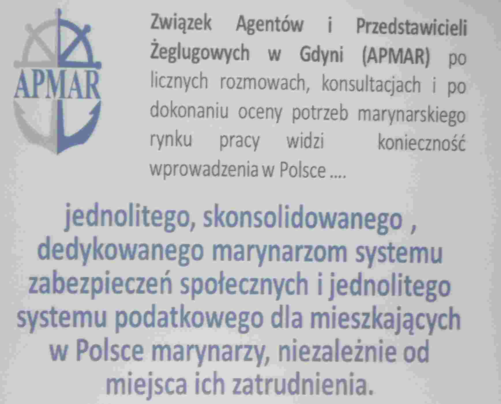 Z inicjatywy Związku Agentów i Przedstawicieli Żeglugowych w Gdyni (APMAR) 16 stycznia odbyło się spotkanie na temat wprowadzenia w Polsce jednolitego, skonsolidowanego, dedykowanego marynarzom systemu zabezpieczeń społecznych i jednolitego systemu podatkowego dla mieszkających w Polsce marynarzy, niezależnie od miejsca ich zatrudnienia.