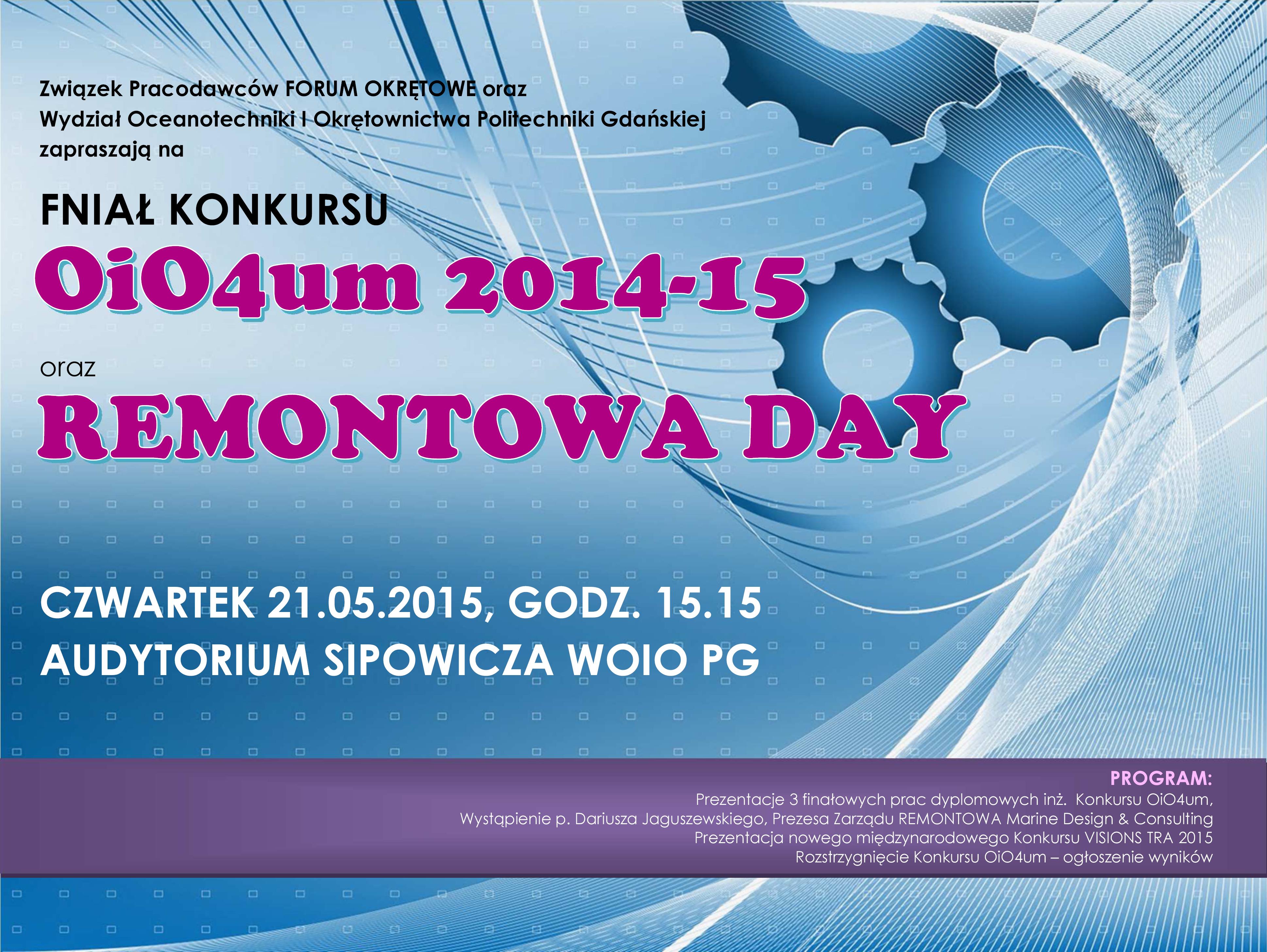 W czwartek, 21 maja na wydziale Oceanotechniki i Okrętownictwa Politechniki Gdańskiej odbędzie się finał konkursu OiO4um 2014/15 na najlepsze prace dyplomowe inżynierskie w okresie od 1 marca 2014 do 28 lutego 2015 roku.
