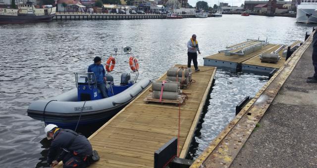 Pomosty zostały zainstalowane w zachodniej części usteckiego portu, w basenie węglowym przy Nadbrzeżu Sopockim. Dostawa pomostów została przesunięta na wrzesień w związku z opóźnieniami w budowie nowego basenu portowego, które uniemożliwiały ich instalację.