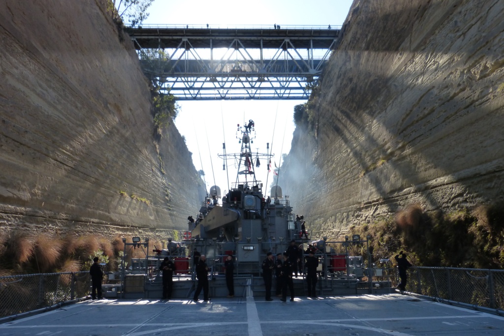Okręty weszły na Morze Egejskie w czwartek, 23 lutego, przechodząc przez Kanał Koryncki, jedno z najciekawszych przejść pod względem nawigacyjnym i krajobrazowym. Następnego dnia zacumowały w Pireusie, w porcie położonym w odległości około 30 kilometrów od Aten. Trzydniowy postój przeznaczony był nie tylko na uzupełnienie zapasów i regenerację załóg okrętów, ale również na oficjalne wizyty i spotkania, między innymi na pokładzie okrętu dowodzenia ORP Kontradmirał X. Czernicki. Była to także znakomita okazja do prezentowania biało-czerwonej bandery oraz obecności polskiej Marynarki Wojennej w tej części Europy. Dowódca SNMCMG2 kmdr Aleksander Urbanowicz złożył wizytę dowódcy greckiej Marynarki Wojennej wiceadmirałowi Ioannis Parlopoulos oraz spotkał się z dowódca Stałego Zespołu Morskiego NATO Grupa 2, niemieckim kontradmirałem Alex Deertz. W niedzielę z kolei na pokładzie polskiej jednostki gościli uczniowie Zespołu Szkół przy Ambasadzie RP w Atenach. Młodzież miała okazje zobaczyć jak na co dzień wygląda służba polskich marynarzy oraz dowiedzieć się o okręcie i misji PKW Czernicki.