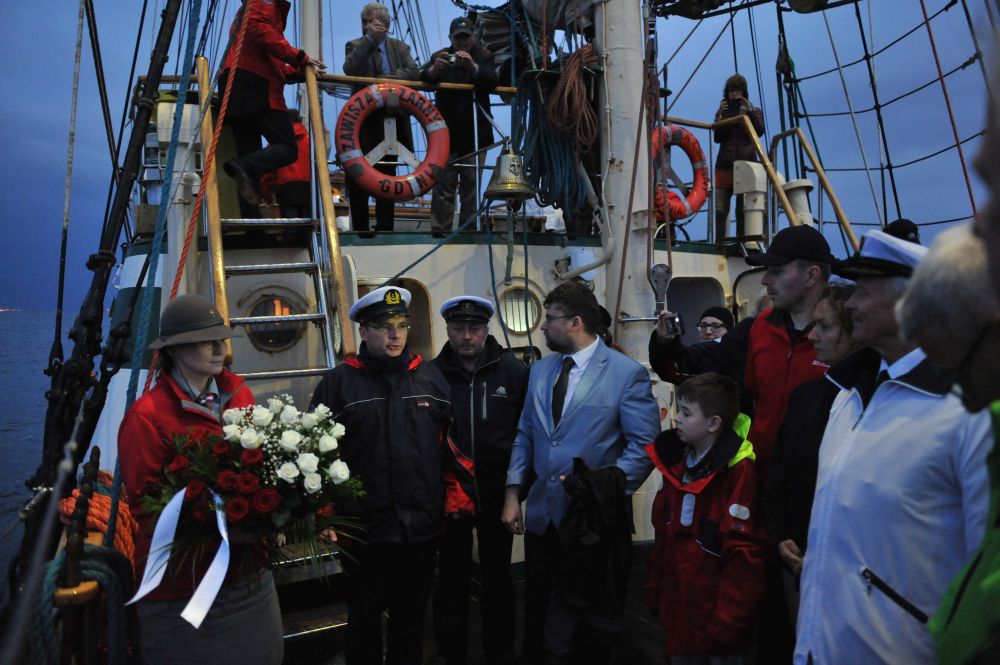 W drugi dzień Święta Morza w Gdyni Zawisza Czarny z harcerzami, żeglarzami i zaproszonymi gośćmi - m.in. senatorem Sławomirem Rybickim, naczelnik ZHP Małgorzatą Sinicą, przedstawicielem wojewody pomorskiego Tomaszem Gieszczem i przedstawicielem marszałka województwa pomorskiego Andrzejem Kowalczysem - wypłynął na Zatokę Pucką, żeby złożyć wiązankę w pobliżu miejsca zatopienia pierwszego żaglowca Zawisza Czarny.
