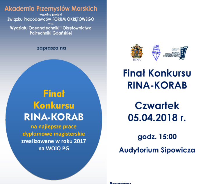 W czwartek, 5 kwietnia o godz. 15:00 w Audytorium im. prof. Sipowicza Wydziału Oceanotechniki i Okrętownictwa Politechniki Gdańskiej odbędzie się Finał Konkursu RINA-KORAB na najlepsze prace magisterskie realizowane w roku 2017. Finał Konkursu jest organizowany w ramach Akademia Przemysłów Morskich.