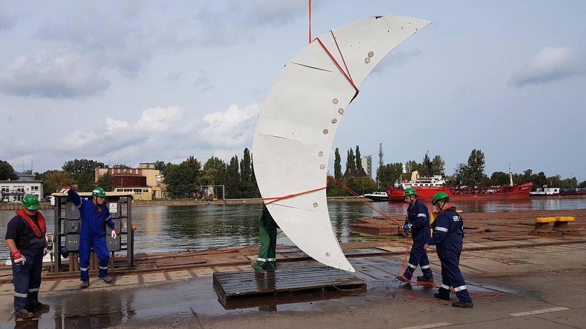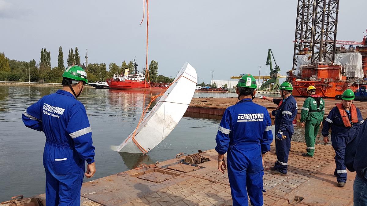 Stoczniowcy nie pozostawili tej prośby bez odzewu. Zanurzony w wodzie obiekt, który przydryfował ze Stoczni Cesarskiej w okolice doku nr 6 Gdańskiej Stoczni Remontowa SA, najpierw zauważyła załoga stoczniowego holownika Panda, pracującego przy sąsiadującej z dokiem, przebudowywanej w tej stoczni platformie Petrobaltic. Stoczniowcy najpierw zabezpieczyli Księżyc, a potem zorganizowali akcję wyciągania go z wody, za pomocą żurawia nabrzeżowego.