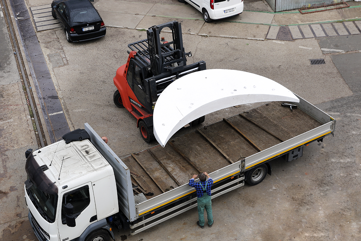 Na zdjęciach u dołu: akcja wydobywania Księżyca z wody i załadunku na ciężarówkę oraz autor rzeźby Bartolomeo Koczenasz ze stoczniowcami Gdańskiej Stoczni Remontowa SA.