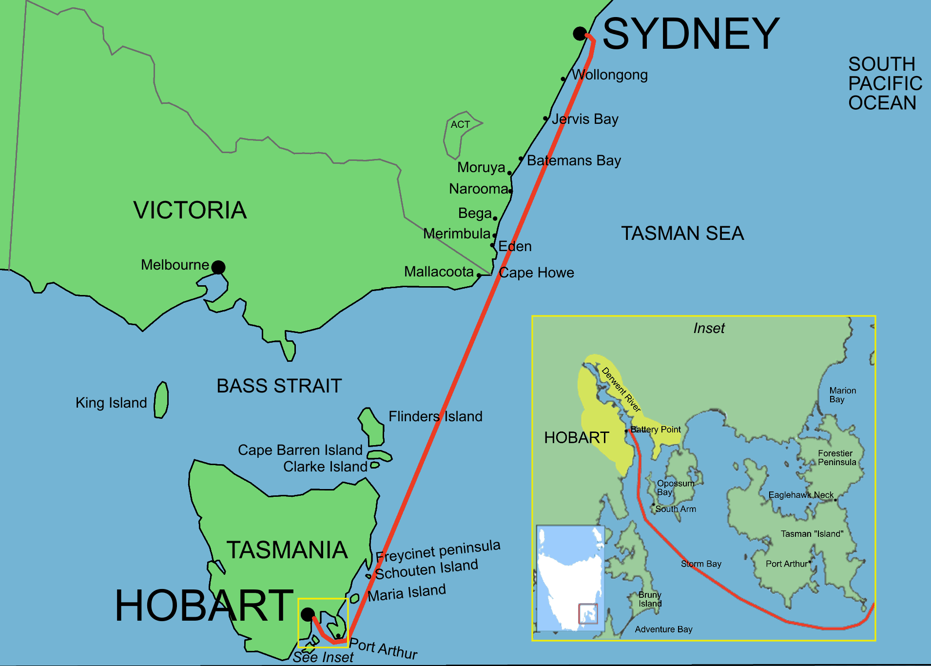 Poniżej: Trasa regat Sydney-Hobart. Ilustr.: Wikipedia