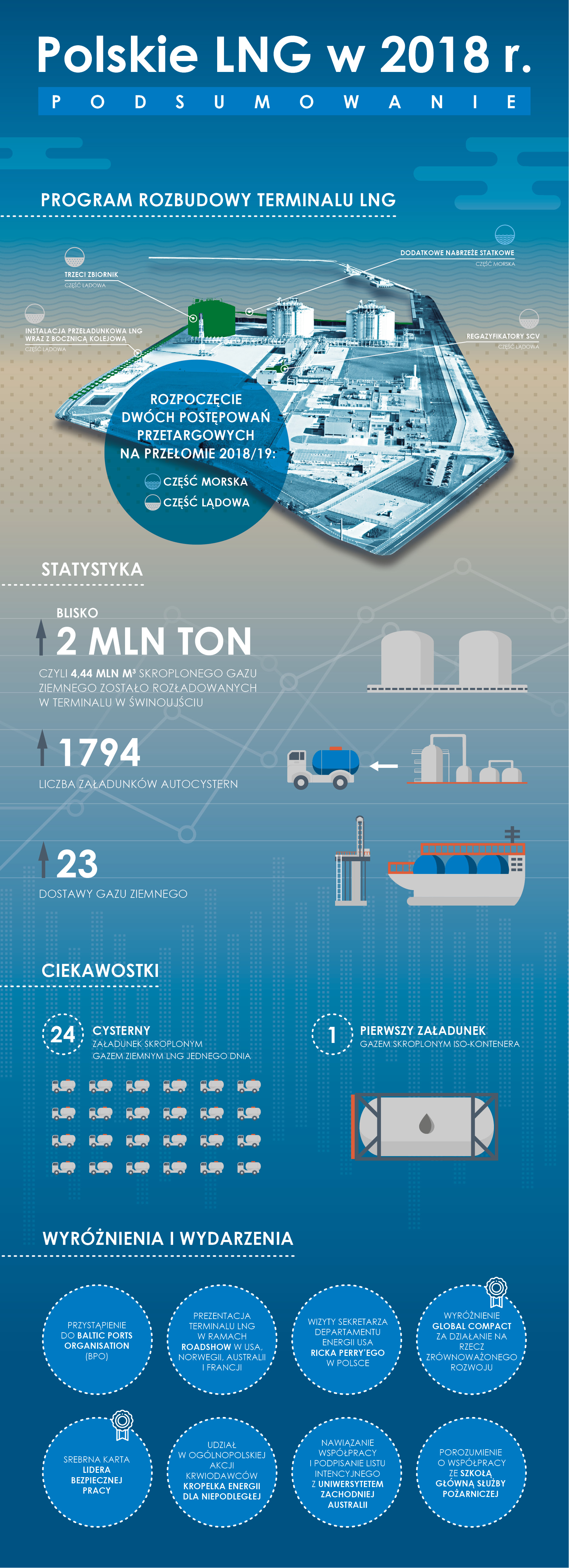 Miniony rok był dla spółki Polskie LNG okresem wzmożonej pracy. Jej efektem są świetne wyniki Terminalu LNG im. Prezydenta Lecha Kaczyńskiego w Świnoujściu oraz realizacja, zgodnie z harmonogramem, Programu Rozbudowy Terminalu LNG. W ramach tego ostatniego, na przełomie 2018/19, spółka rozpoczęła dwa procesy przetargowe, na tzw. część lądową (dodatkowa instalacja regazyfikacyjna, trzeci zbiornik LNG oraz instalacja przeładunkowa LNG na kolej) i część morską (dodatkowe nabrzeże statkowe).