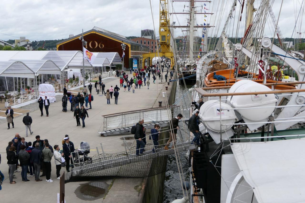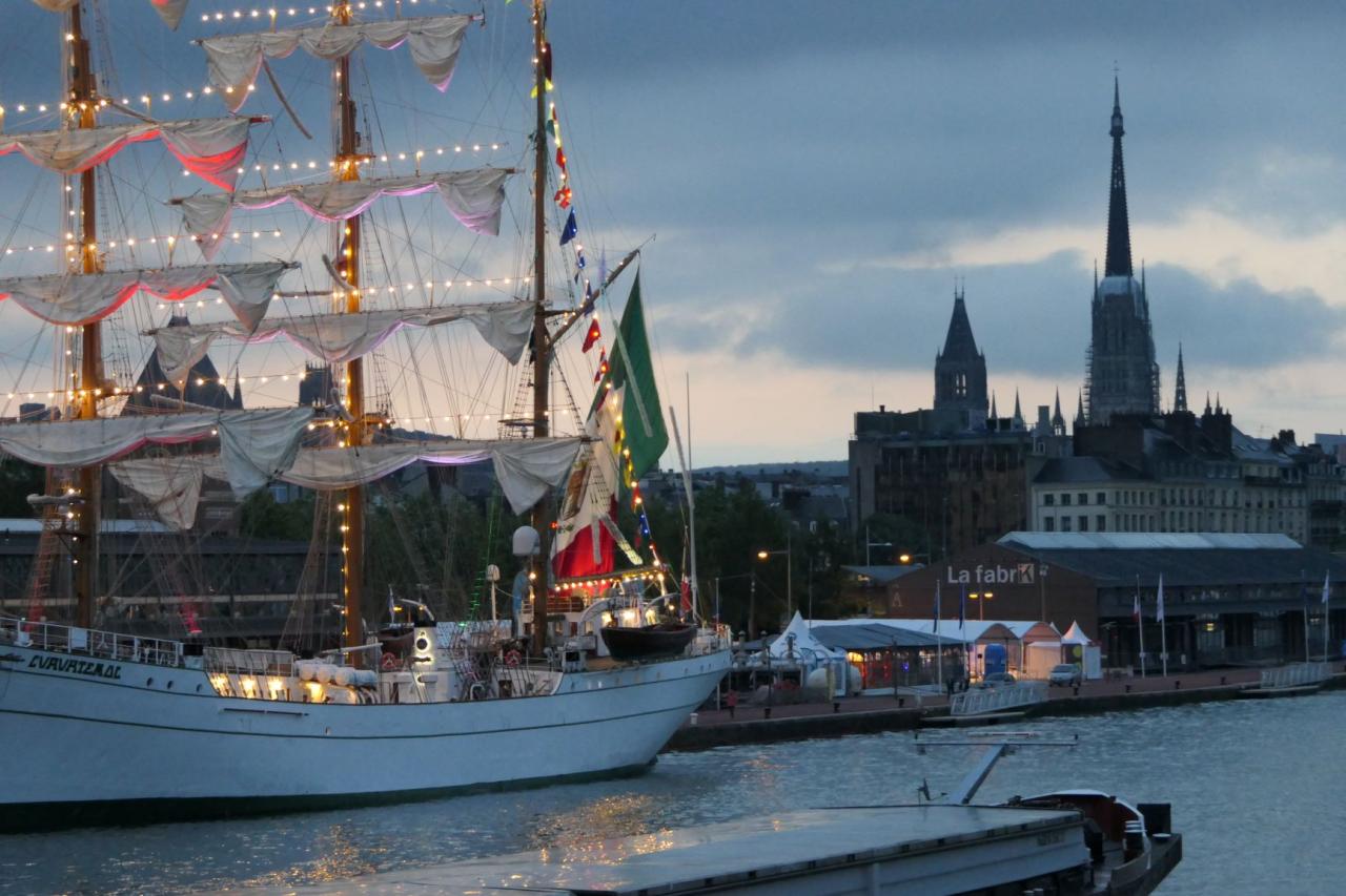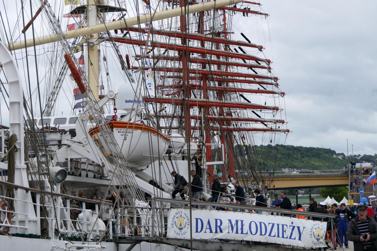 Na redę Le Havre dotarliśmy 05/06 wieczorem i przez całą noc płynęliśmy w górę Sekwany, żeby o 06.00 zacumować wśród największych żaglowców. Tuż za nami stoi Siedow, jest też Mir, Kruzenshtern, Mircea, Shabab Oman II, Cisne Branco, Cuauthemoc, Belem i wiele innych. Podobno ma być 50 statków. Żaglowce stoją blisko siebie po obu stronach Sekwany.