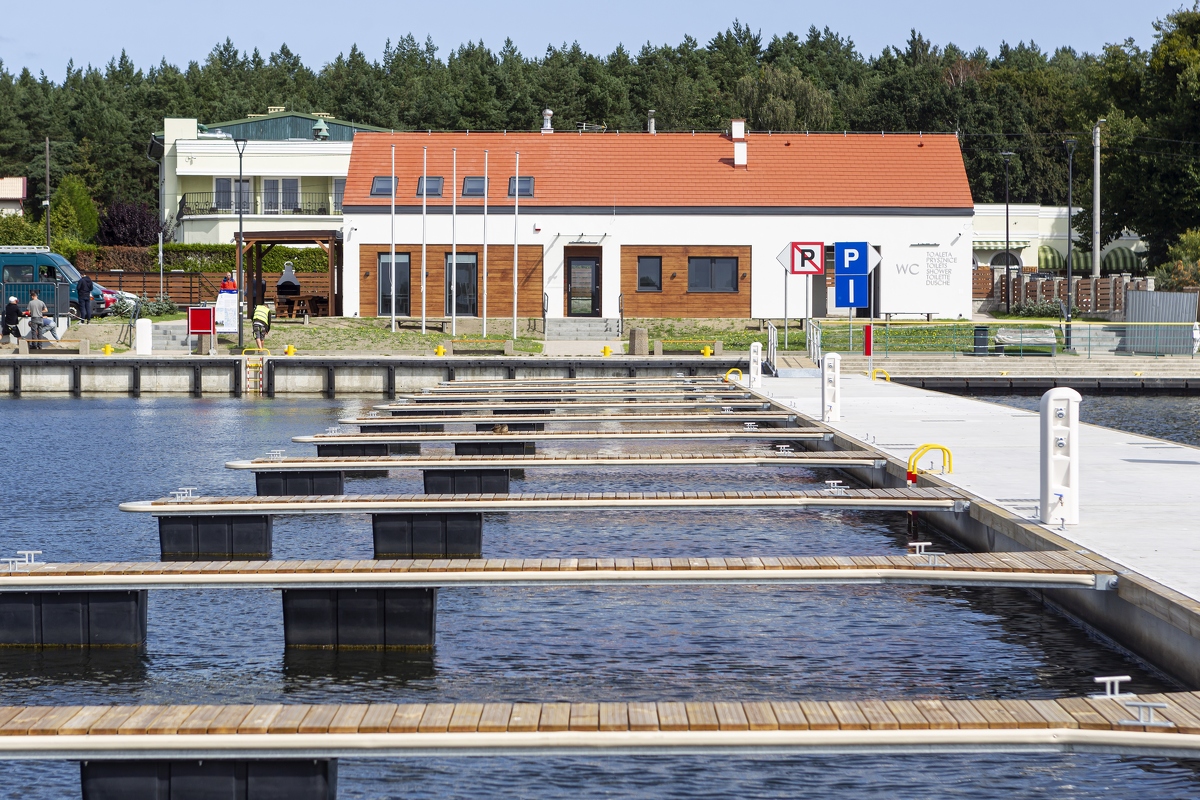 Przygotowano slip (miejsce wodowania żaglówek) dla jednostek pływających o wymiarach 6x6,5 m. Nabrzeże zostało wyposażone w drabinki wyłazowe, odbojnice, stojaki na koła ratunkowe i postumenty oświetleniowe. Oprócz infrastruktury wodnej na terenie przystani wybudowano także budynek bosmanatu z zapleczem socjalnym, pomieszczeniami technicznymi i salą szkoleń dla około 20 osób. Ponadto przy nabrzeżu pojawiła się m.in. wiata z zabudowanym paleniskiem na grill. Została ona funkcjonalnie połączona z salą szkoleniową, umożliwiając organizowanie wydarzeń żeglarskich z wykorzystaniem przestrzeni wiaty i sali szkoleniowej jednocześnie.