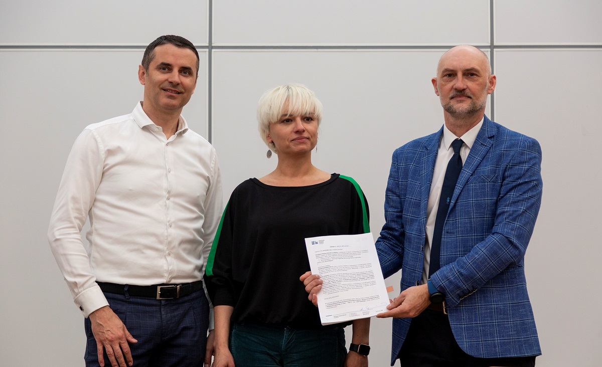 Na zdjęciach poniżej: Umowa na II etap została podpisana. Od lewej: Stanisław Poniewierka – prezes firmy Poleko Budownictwo, Katarzyna Głażewska – architekt z firmy plus3-architekci, oraz dr Robert Domżał - dyrektor NMM; projekty wnętrz nowego muzeum - autor: plus3-architekci