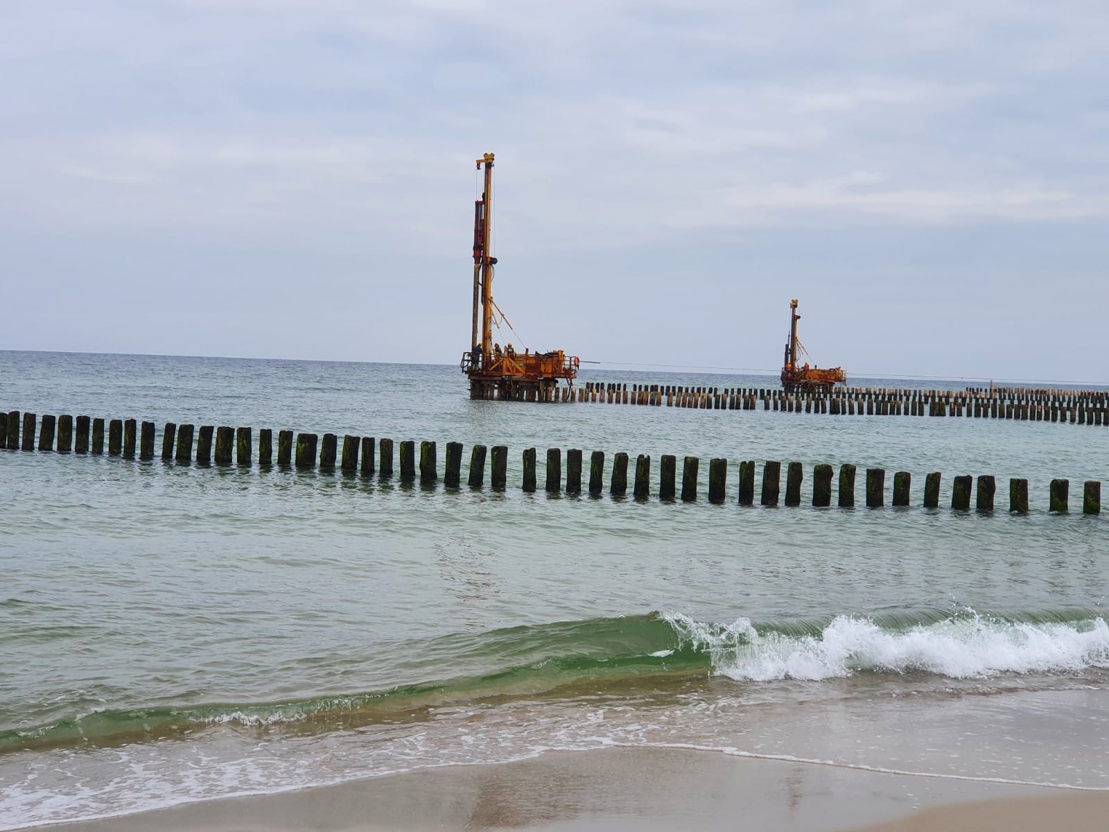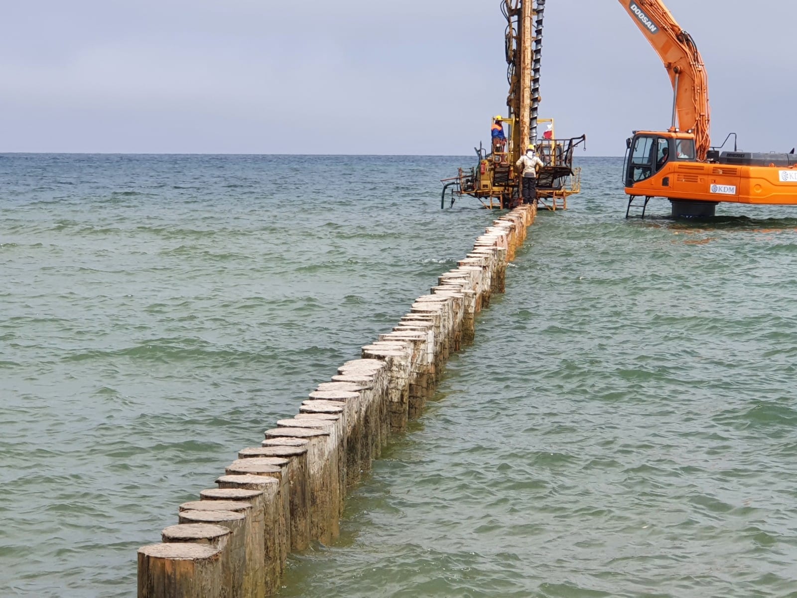 Wykonane prace obejmowały rozbiórkę, poprzez wyrywanie i utylizację, 12 184 istniejących pali drewnianych, stanowiących konstrukcję 110 starych, istniejących ostróg brzegowych. Wykonano również 135 nowych ostróg o długości 100 m każda w około stumetrowym rozstawie. Składają się one z pali z tworzywa, pochodzącego z recyclingu, w części lądowej o średnicy 25 cm i długości 4,0 m. Tych pali jest łącznie 4 320 szt. Zastosowano również nieodżywicznione pale drewniane o średnicy 25-34 cm o długości od 5,5 m w początkowej fazie do 11 m w części końcowej ostrogi w ilości 26 721. Łącznie pogrążono 31 041 pali – mówi Robert Mokrzycki, Główny Inspektor Ochrony Wybrzeża, Urząd Morski w Gdyni.