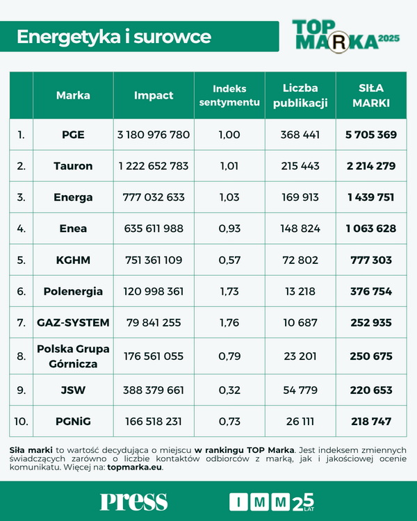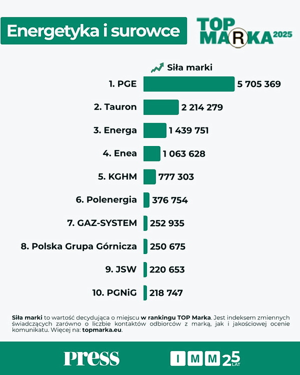W rankingu Top Marka 2025 Grupa PGE zajęła zdecydowane pierwsze miejsce, z siłą marki ponad dwukrotnie wyższą niż drugi w zestawieniu Tauron. Wynik ten osiągnięto dzięki strategicznym i szeroko relacjonowanym inwestycjom w OZE oraz działaniom na rzecz eliminacji węgla jako surowca.