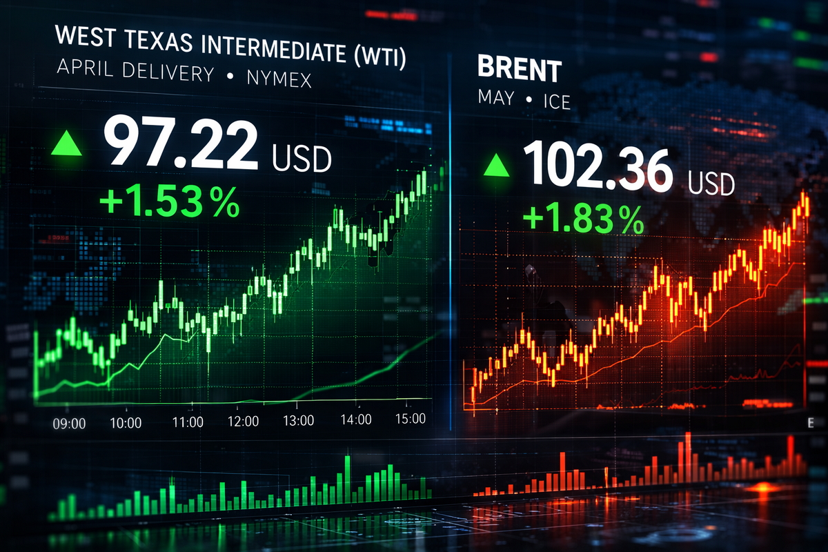 Baryłka ropy West Texas Intermediate w dostawach na kwiecień zwyżkuje na NYMEX w Nowym Jorku o 1,53 proc. do 97,22 USD. Cena Brent na ICE na maj rośnie o 1,83 proc. do 102,36 USD za baryłkę. W tym tygodniu cena WTi wzrosła o 7 proc., a Brent o 9 proc.