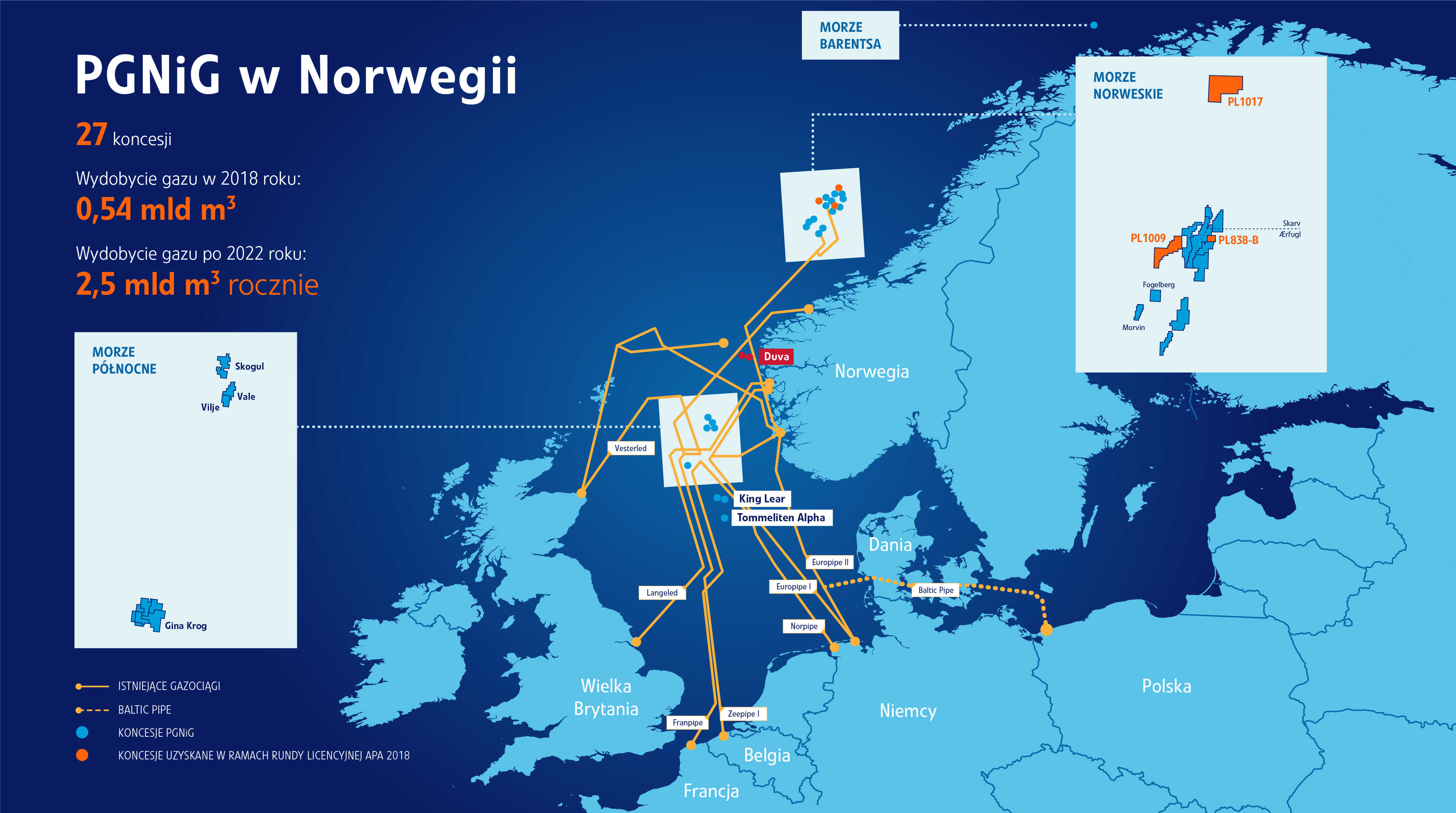 Obecnie PGNiG Upstream Norway posiada udziały w 27 koncesjach na Norweskim Szelfie Kontynentalnym, gdzie jest operatorem na czterech z nich.