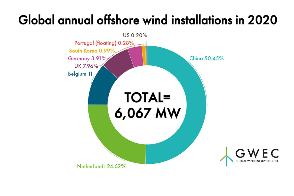 To niewielki spadek w stosunku do roku 2019, kiedy to przybyło 6,145 GW. Chiny z wynikiem nieco przekraczającym 3 GW znalazły się na czele krajów z najszybszą rozbudową morskich mocy wiatrowych trzeci rok z rzędu. Prawie jedna czwarta przypadła na Niderlandy, gdzie przybyło niemal 1,5 GW. 706 MW doszło w Belgii, ponad 483 MW w Wielkiej Brytanii, a 237 MW w Niemczech.