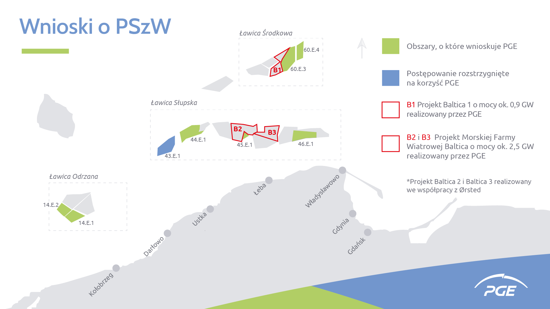 Jak podkreślił prezes PGE Wojciech Dąbrowski, uzyskanie największej liczby punktów w postępowaniu jest równoznaczne z uzyskaniem przez PGE pozwolenia na zagospodarowanie obszaru 43.E.1. Wskazał, że obszar ten znajduje się blisko innych morskich projektów wiatrowych PGE oraz budowanego portu serwisowego w Ustce, co pozwoli na wykorzystanie efektu synergii i skali prowadzonej działalności.