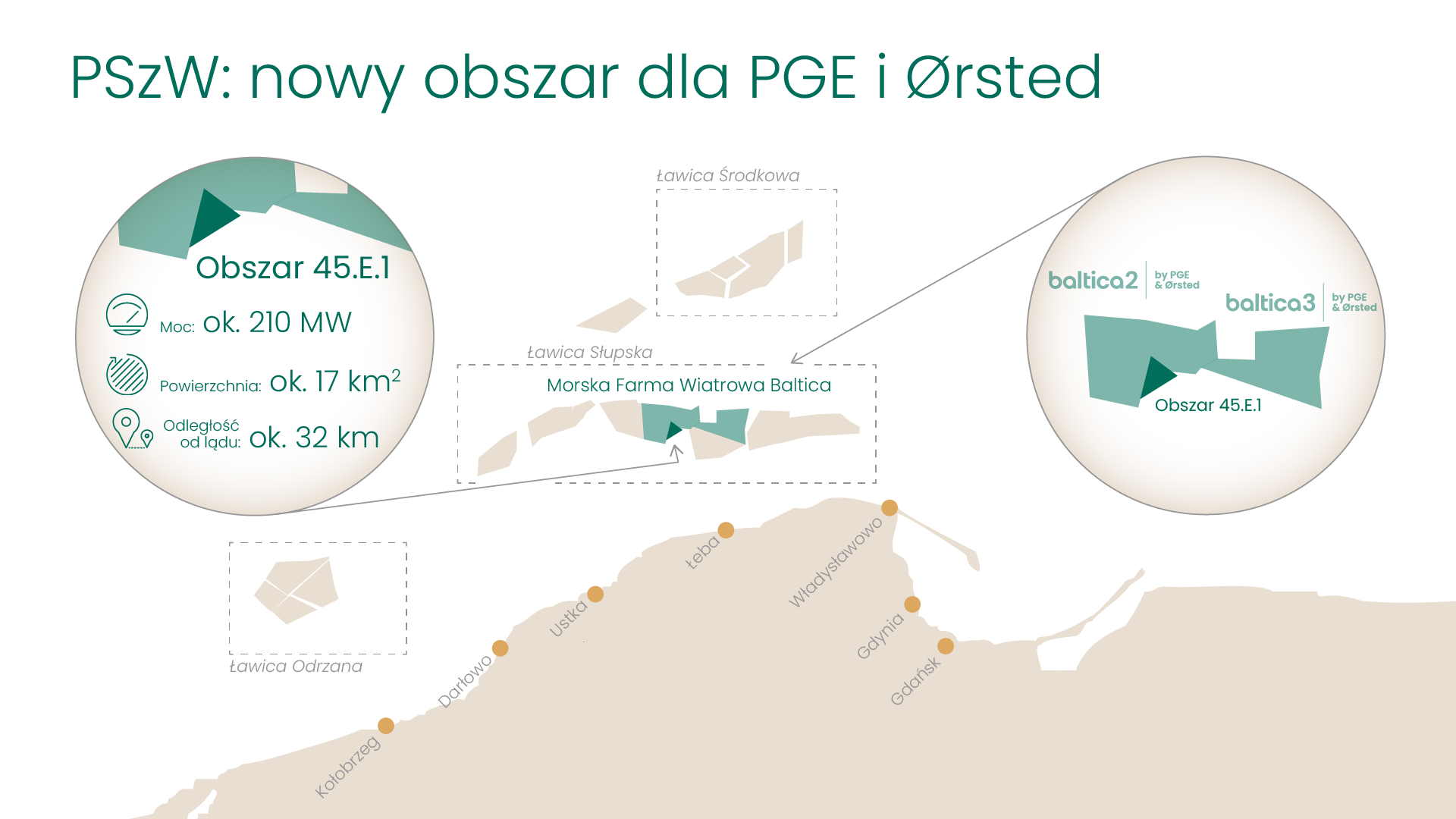 PGE i Ørsted chcą zbudować na akwenie 45.E.1 zlokalizowanym na Ławicy Słupskiej moce wytwórcze na poziomie 210 MW. Obszar ma powierzchnię ok. 17 km kw. i zlokalizowany jest ok. 32 km od brzegu morza. Wnioskowały o niego wspólnie PGE i Ørsted tworzące spółkę joint-venture.