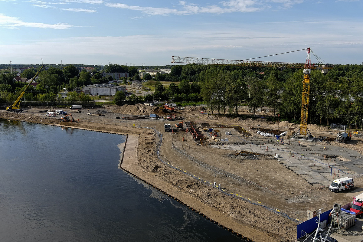 Trwają także prace przy sieciach sanitarnych i kanalizacji deszczowej. Wkrótce rozpoczną się roboty związane z instalacjami elektrycznymi i systemami zasilania. W planach są również specjalistyczne prace przy konstrukcji nabrzeża z wykorzystaniem mikropali. Jednocześnie prowadzone są intensywne prace projektowe, które pozwalają na płynne przechodzenie do kolejnych etapów budowy.