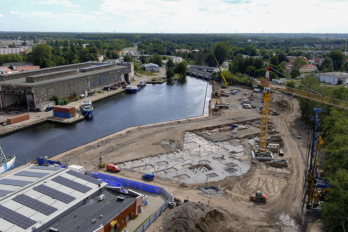 Na lądzie dobiega końca etap prac geotechnicznych, polegających na wzmocnieniu podłoża, m.in. poprzez wykonanie pali fundamentowych. Na placu budowy pojawił się żuraw wieżowy, który wspiera kolejne działania. Trwają prace fundamentowe – wylewane są betony podkładowe i układane zbrojenia. Na teren inwestycji regularnie docierają nowe dostawy stali. We wrześniu planowane jest wylanie pierwszego betonu konstrukcyjnego pod nowe budynki – najpierw pod część magazynową, następnie pod część socjalno-biurową.