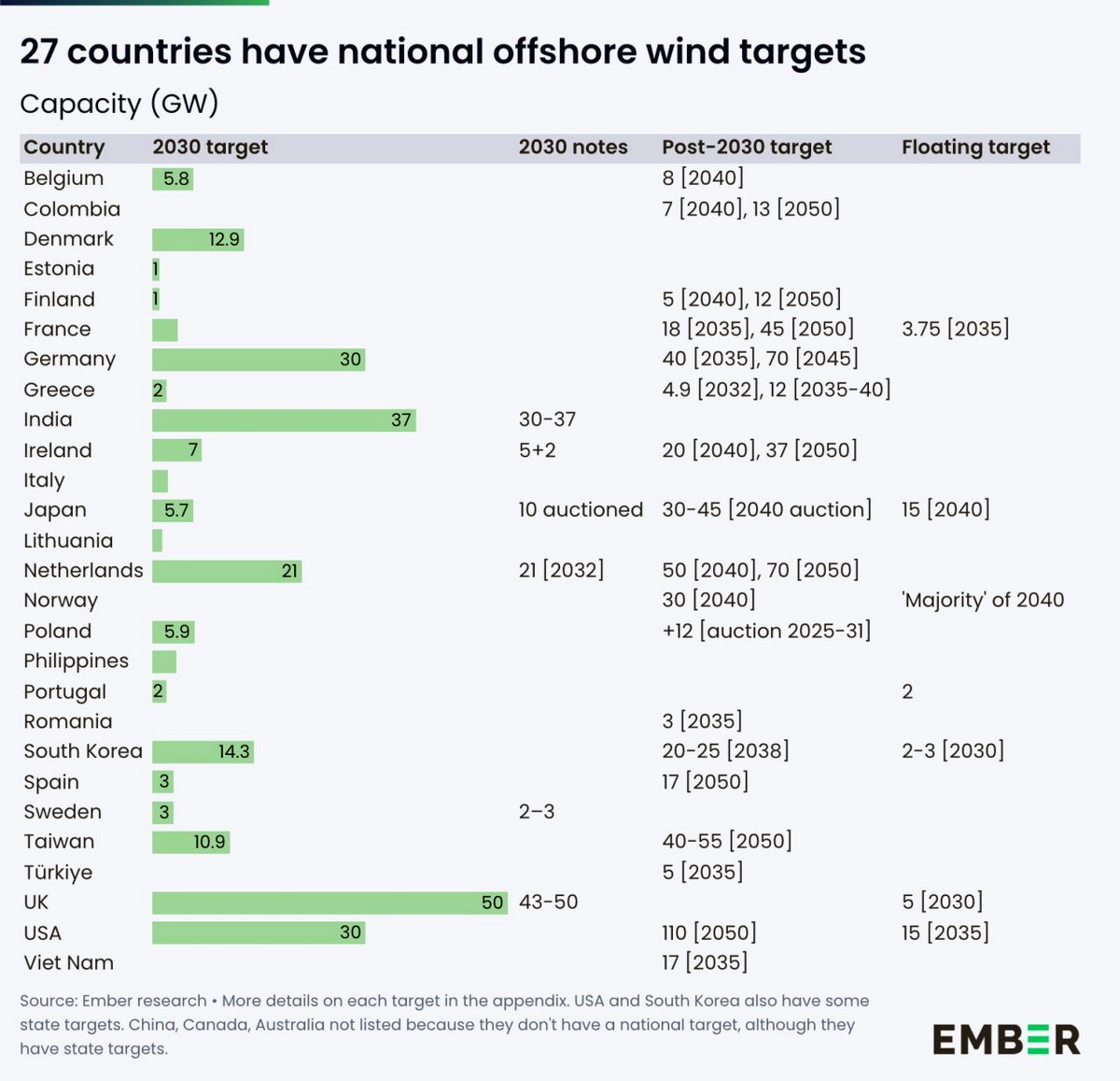 Europa, choć prawdopodobnie nie zrealizuje wszystkich krajowych celów na czas, ma osiągnąć najlepsze wyniki spośród wszystkich regionów świata. Think tank Ember przewiduje, że państwa europejskie osiągną większość swoich planów wiatrowych z niewielkim opóźnieniem – rok lub dwa po 2030 r.