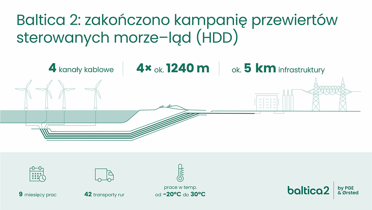– Pomyślna instalacja czwartego i ostatniego odcinka kabla HDD stanowi znaczący krok naprzód w realizacji projektu i odzwierciedla doskonałą koordynację oraz zaangażowanie całego zespołu projektowego, a także współpracę z naszymi wykonawcami. Jesteśmy szczególnie dumni z wysokiej kultury bezpieczeństwa, jaką udało nam się wypracować na placu budowy podczas tej wymagającej technicznie operacji, oraz z zaangażowania wszystkich pracujących tam osób. W kwietniu zostaną przeprowadzone prace pogłębiarskie w dnie morskim w celu zabezpieczenia czterech końcówek rur osłonowych. Zakończy to etap przygotowań do instalacji kabla eksportowego oraz do procesu łączenia kabli morskich i lądowych. Wszystko to robimy, aby umożliwić systemowi kablowemu przesyłanie energii wytworzonej przez morską farmę wiatrową do polskiej sieci energetycznej – powiedział Ulrik Lange, Dyrektor zarządzający projektu Baltica 2 w Ørsted.