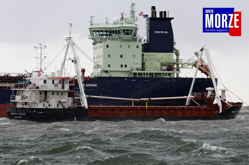 Mały frachtowiec Danica Violet szczęśliwie dotarł do portu Gdynia i zmierza do stoczni remontowej. W tle zbiornikowiec przy stanowisku przeładunkowym przy falochronie głównym portu Gdynia.