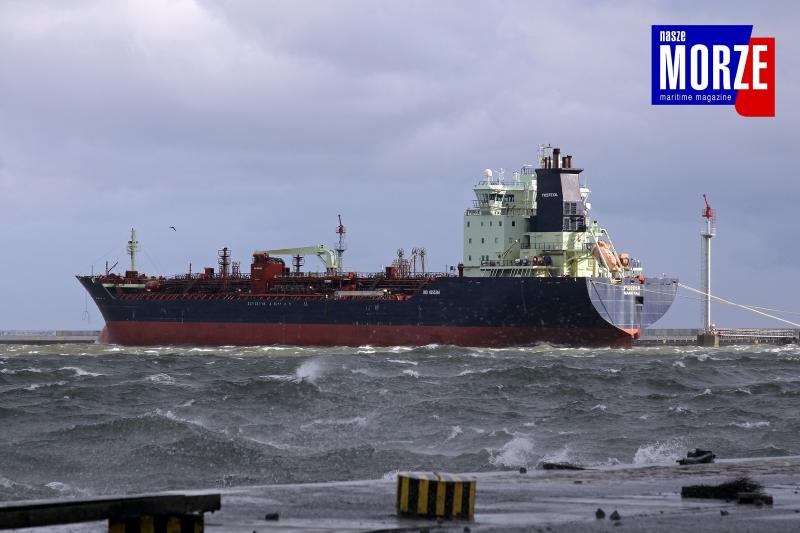 Fiński zbiornikowiec Purha przy stanowisku przeładunkowym przy falochronie głównym portu Gdynia.